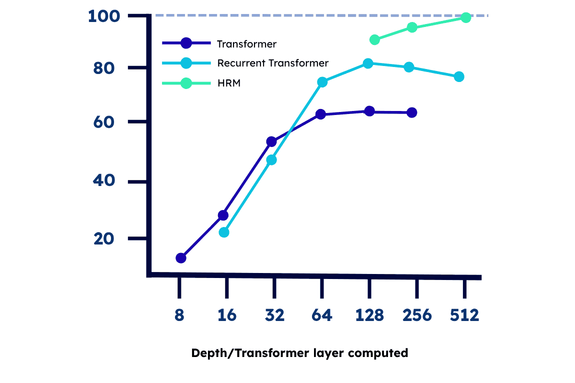 Desempenho superior: Supera LLMs em tarefas complexas como Sudoku extremo, labirintos grandes e o ARC-AGI, benchmark de inteligência geral.