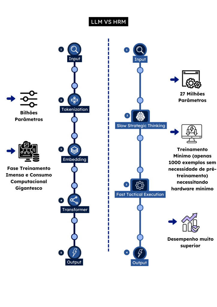 Eficiência em parâmetros: Enquanto LLMs demandam bilhões, o HRM usa apenas 27 milhões.